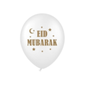 Vita ballonger med guldig tex: Eid Mubarak. Tillverkade av latex. Kan fyllas med både luft och helium.