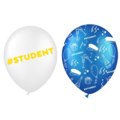 3 blue 12" balloons from Hisab Joker with white print and 3 white balloons with yellow print, perfect for decorating at the graduation party.