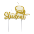 Festive cake candle with gold glittery text "student." Decorate the cake or other dessert at the graduation party.