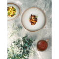 Vacker flat tallrik i vit och beige färg ur serien Salema från Fortessa. Tallriken är tillverkad av stengods med oregelbunden form som lyfter bordsdukningen till högre höjder.