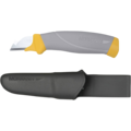 Special function for cable stripping. An integrated ergonomic finger guard on the blade, double-moulded rubber grip and stainless steel blade. Safe handling. Prevents work related injuries. Sheath of impact resistant plastic with easy attachment and removal from belts and buttons.