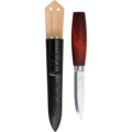 Red wooden handle made of painted birch. Carbon steel blade, making it easy to resharpen – just remember that it requires maintenance. Wipe it clean and oil it after use.