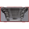 Set of 8 ratcheting combination spanners. Chrome vanadium steel. Combined open ended spanner and 12 point ring ratchet. Reversible ratchet function with lever. Same size at both ends.