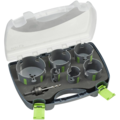 Universal hole saw set with cemented-carbide teeth for wood, chipboard, MDF, plasterboard and plastic. Very fast hole making with minimal heat development and a long life.Saw depth 59 mm. A keyless chuck holder with lock function and keyless chuck adapter included on each holesaw. Saves time when replacing holesaws.