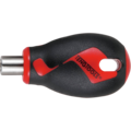Stubby bit screwdriver for 1/4' bits. With magnet that keeps both the bit and screw in place. Two component handle with hanging hole.