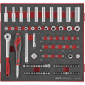 Levereras i inbyggnadslåda av plast med avtagbart lock. Verktygen ligger i EVA-skum i tre olikfärgade lager. Lådorna passar i Teng Tools verktygslådor och vagnar.