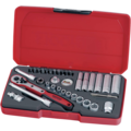 Contains sockets with 6-point opening. Also includes a bit socket 1/4', adapter drive 3/8'–1/4', extension bars 50 and 100 mm, universal joint, fibre reinforced ratchet handle for both right and left-hand action, 3 hex keys and 11 bits.Supplied in a red plastic case with snap locks and hinges with metal pins.