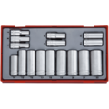 Socket set Long 3/8 mm TT 3816 from Teng Tools. Socket set of 16 long hex sockets with a 3/8" square drive. Delivered in a plastic box with a removable lid. Fits in Teng Tools toolboxes and assembly carts.