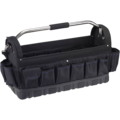 Professional 24' open tool case with hard PE bottom. Steel handle with ergonomic rubber grip. Saw pocket in durable ballistic nylon with adjustable Velcro strap. Rubberised Velcro strap to store large objects such as spirit levels. Velcro strap, perfect for securing a 600 mm spirit level. Padded shoulder strap.