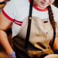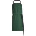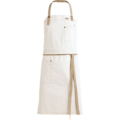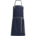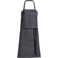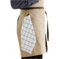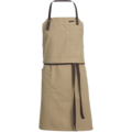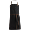 Canvas apron with an adjustable neckband featuring a button and buttonhole. Practical details include a two-piece chest pocket, a hip pocket, and a barista strap. The breast patch can be redone so that it can be used as a serving apron.