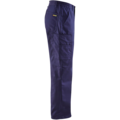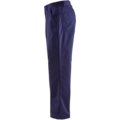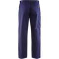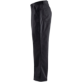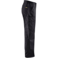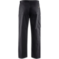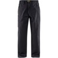 A flexible pair of pants with a tape measure pocket, leg pocket, and elastic waistband. Zipper in the fly.