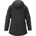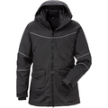 Ytterjackan. Dragkedja fram. Fyra framfickor med tryckknappar. Reflexer fram, bak och på ärmar. Avtagbar huva med tryckknappar. Foder i ytterjackan. Tejpade sömmar över axel och sidsömmar m.m.