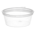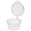 Pyöreä kastikekuppi 6 cl ja siihen kiinteästi liitetty riippukansi, sopii täydellisesti pienempien kastikeannosten pakkaamiseen.