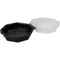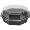 Musta 8-kulmainen salaattirasia läpinäkyvällä kannella. Tilavuus: 800ml. Mitat: 190x190x80 mm