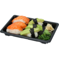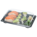 Täydellinen sushialusta 6-8 palan sushille! Sushialustan ja kannen mitat ovat 19x13x4,5 cm. Siinä on läpinäkyvä kupolikansi ja musta pohja.