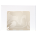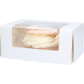 Valkoinen ikkunallinen leivoslaatikko. Leivoslaatikko sopii erinomaisesti upeiden leivonnaisien, kuten leivosten, voileipien, pikkuleipien ja pullien kuljetukseen.