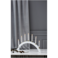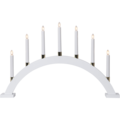 Valkoinen puinen kaarikynttelikkö, jossa on messinkiyksityiskohtia. Tyylikäs koriste joulun aikaan. Kynttelikössä on seitsemän kynttilää.