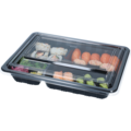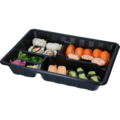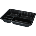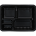 Musta muovinen viisilokeroinen bento-rasia. Rasia sopii erinomaisesti bento-tarjoiluun, ja läpinäkyvän kannen ansiosta tuotteet on helppo esitellä asiakkaille.