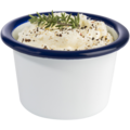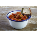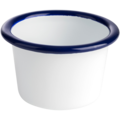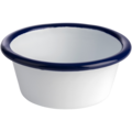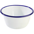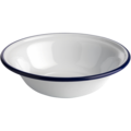 Skål i vit emaljerat stål med blå dekorrand runt kanten ur serien Enamelware. En skål som passar bra till servering av tillbehören, efterätten eller annat.