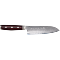 Santokukniv ur Yaxells imponerande serie Super Gou, som består av damaskerade knivar med en massiv uppbyggnad av stål av bästa kvalitet. Den här japanska kniven med högt blad och rundad spets passar till grönsaker, fågel och kött.