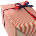 Punaraidallinen kuitupaperi. Tämä yksinkertainen ulkonäkö käy moneen eri sesonkiin. Yhdistä niininauhaa, lahjanauhaa, juuttinarua tai taftinauhaa ja luo eri tyylejä.