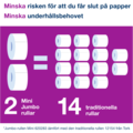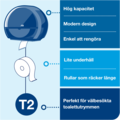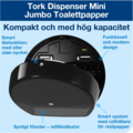 Tork-annostelija Mini Jumbo -wc-paperille (T2). Sopii parhaiten käymälätiloihin, joissa on kohtalaisen paljon tai paljon kävijöitä. Annostelijassa on fiksu rullapidike rullanlopuille, joten paperi ei koskaan pääse loppumaan. Mitat: 345x132x275 mm.