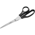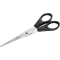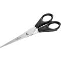 Tavalliset sakset Durable-merkiltä, jotka sopivat hyvin paperin ja tekstiilin leikkaamiseen. Muovikahva, ruostumaton metalliosa ja pyöristetty pää.
