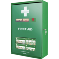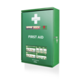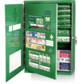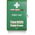 Ensiapukaappi Cederrothilta. Kaappi on metallia ja siinä on kaksi ovea, jotka jakavat kaapin kahteen osioon. Ulompi osio, jossa on ensiapuopastaulu nopeaa toimintaa varten, ja sisempi, lukittava osio, jossa suuri säilytystila.