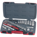 Hylsnyckelsats 3/8 T3839 från Teng Tools. Innehåller 39 delar som levereras i röd plastlåda med säkerhetslås av plast, infällbart handtag och gångjärn med metallsprint. Lådans undersida är försedd med gummifötter för att den ej skall glida.