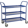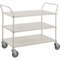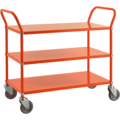 Snygg plåtvagn med tre hyllplan som kan monteras med kant upp eller ner efter eget behov. Kulörvagn 3 plan med broms från Kongamek passar utmärkt som serveringsvagn eller som transportvagn i skolor och på kontor.