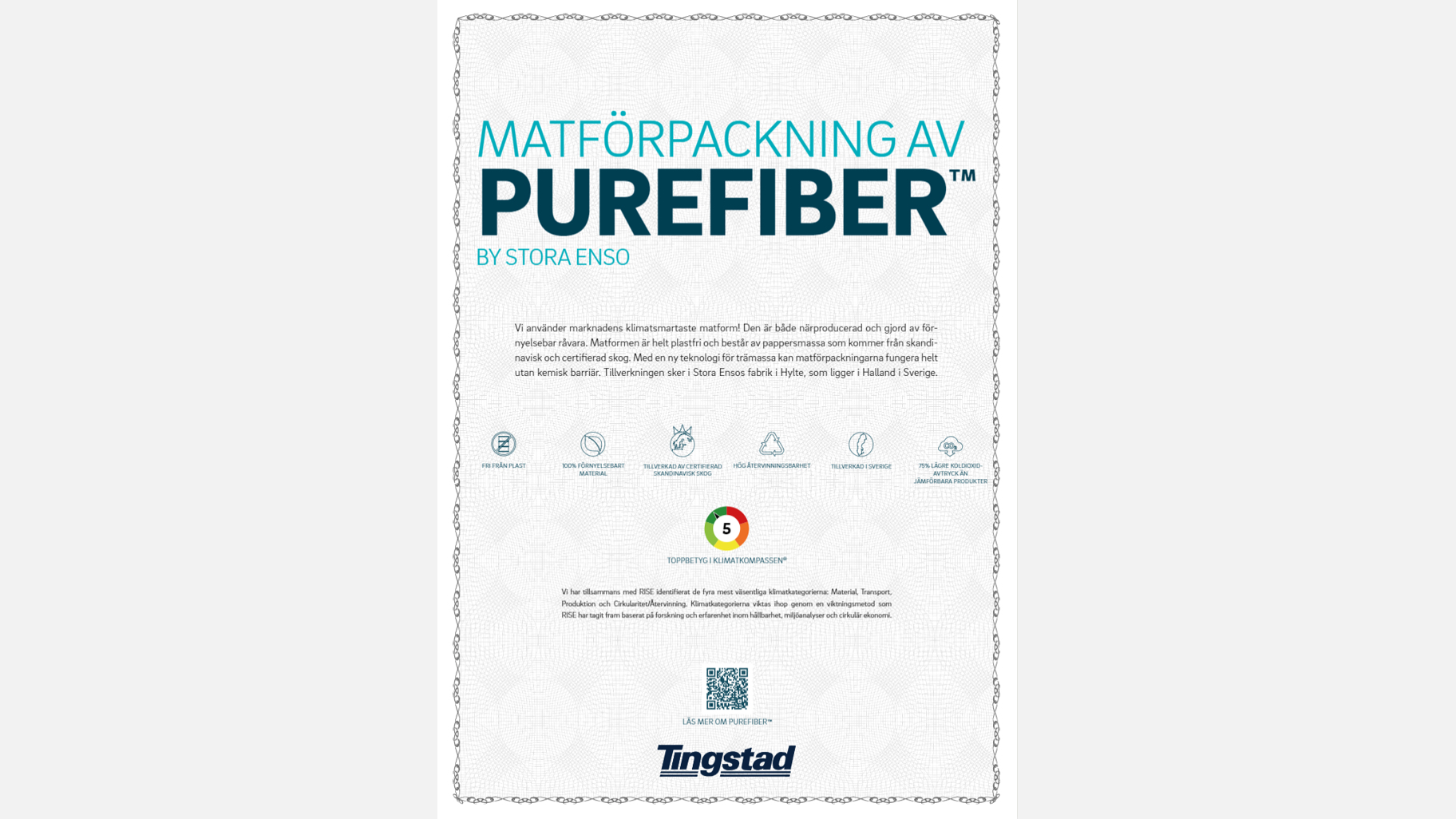 Certifikat för PureFiber™ by Stora Enso.