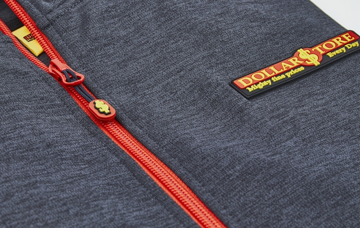 Logotypen är en stor del utav detaljerna för att varumärket ska synas tydligt i kommunikationen. Här har vi valt att ta fram och arbeta med påsydda gummiloggor och skapa en häftig men också exklusiv 3D-känsla. Med Dollarstores återkommande röda och gula färger i deras kläder sticker detaljerna ut och förmedlar varumärket vidare.