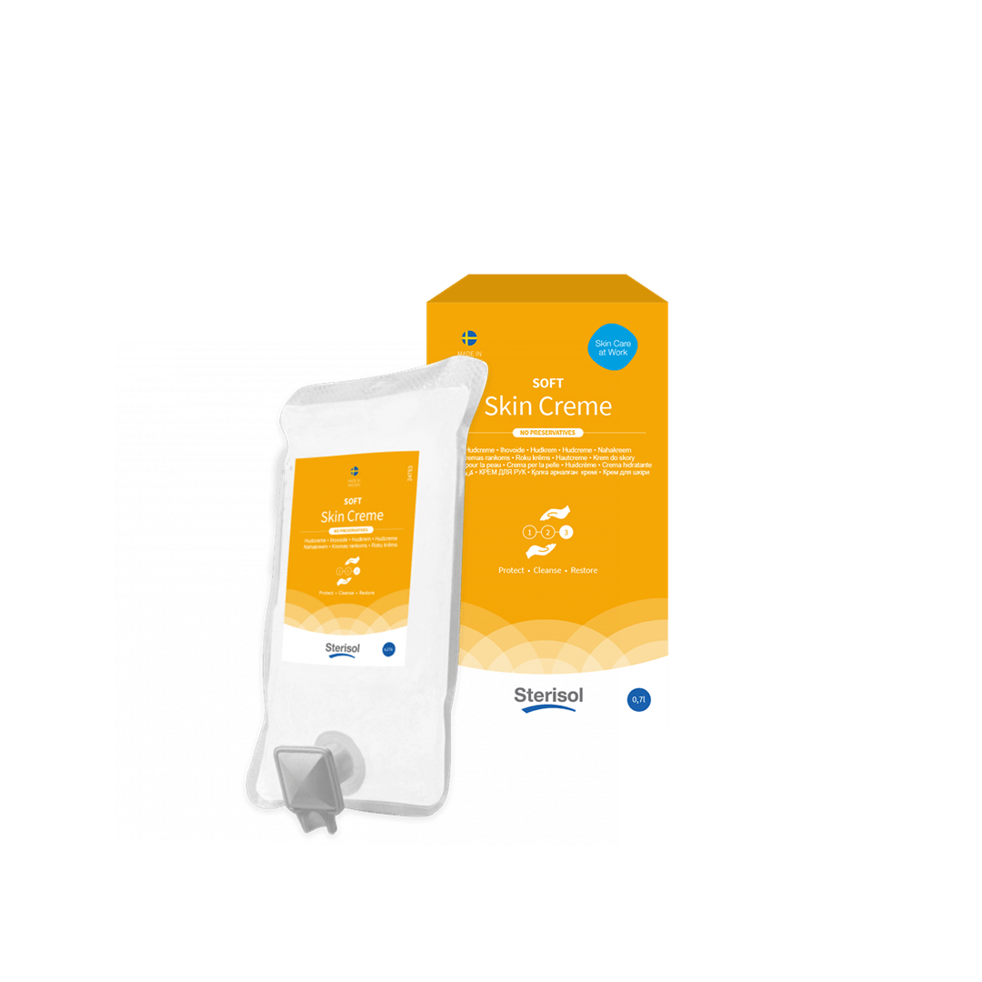 Sterisol SOFT Skin Creme är en mjukgörande hudkräm med återfettande egenskaper som passar till så väl händerna som till övriga kroppen. Den är utvecklad för att effektivt återfukta torr och känslig hud och används med fördel efter varje tvätt. Passar särskilt bra i verksamheter där man behöver tvätta händerna ofta eller vid våtarbeten. Krämen är Svanenmärkt och dermatologiskt testad med gott resultat samt även Allergy Certified i den oparfymerade varianten.