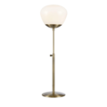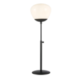 Bordslampa Rise från Markslöjd, här i en mindre variant, har en bas i metall och en skärm i vitt glas. Lampan är utrustad med en justerbar fot och en 2 meter lång svart textilkabel med brytare på sladden och väggkontakt.