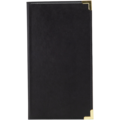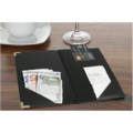 Notapärm 23,9x13,1cm i svart läder från Securit. Klassisk och charmig kvittohållare i svart PU läder med sydda kanter och hörn av guldfärgad metall som avger en exklusiv känsla. Två sidofack och ett fack för kort håller sedlar, mynt och kreditkort på plats.