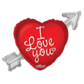 En röd hjärtformad folieballong med ett hjärta med pil. Perfekt till alla hjärtans dag bland annat.