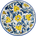Flat tallrik 15cm ur serien Albufera från Bonna. Tallriken är idealisk för varma restauranger med sina livfulla färger och blommiga motiv i gult och blått, Inspirerad av traditionella mönster av Sicilien. Den blå kanten runt tallriken symboliserar medelhavsgeografin.
