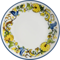 Flat tallrik 27cm ur serien Albufera från Bonna. Tallriken är idealisk för varma restauranger med sina livfulla färger och blommiga motiv i gult och blått, Inspirerad av traditionella mönster av Sicilien. Den blå kanten runt tallriken symboliserar medelhavsgeografin.
