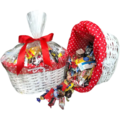 Julkorg med tyg är en charmig godiskorg med rött tyg och vita prickar. Fylld med 2,5 kg noga utvalt julgodis. Den är perfekt att ställa på fikabordet eller skicka som en omtänksam julpresent till kunder. Allt godis är inslaget i papper, paketerat i cellofan och dekorerat med röda sidenband för en extra festlig känsla.