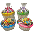 Påskkorg i glada färger med massvis av godis. Påskkorgar i härliga blandade vårfärger är inslagna i cellofan och vackra sidenband – passar petfekt som en påskgåva.