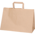 Brun papperskasse med platt handtag, tillverkad av oblekt kraftpapper. Med en volym på 15 liter och måtten 350x170x250 mm är den lämplig för transport av matlådor, mindre varor eller presentartiklar. Konstruktionen med platt botten gör den enkel att packa och stapla.