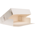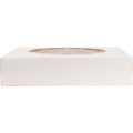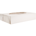 Cateringlåda med fönster i måtten 360x250x80 mm är en praktisk och stilren kartong för servering och transport av plockmat, bakverk och delikatesser. Den är tillverkad i vit kartong med dekorativt mönster och har ett transparent PLA-fönster som lyfter presentationen av innehållet.