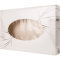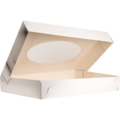 Cateringlåda med fönster i storlek 550x365x80 mm är den största modellen i serien och passar utmärkt för uppläggning och transport av större mängder plockmat, bakverk och delikatesser. Den är tillverkad i vit kartong med dekorativt mönster och har ett transparent PLA-fönster som lyfter presentationen av innehållet.