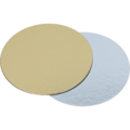 Runda vändbara tårtbrickor i premium kvalitet, tillverkade i kartong med alu-beläggning. Den ena sidan är silverfärgad och den andra är i guld.
