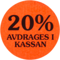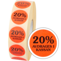 Rund etikett med text ''20% avdrages i kassan'' är etiketten för dig som vill rea ut eller sänka priset på produkter i din butik. Den röda färgen får kunderna att lägga märke till priset och produkten.