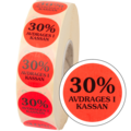 Rund etikett med text ''30% avdrages i kassan'' är etiketten för dig som vill rea ut eller sänka priset på produkter i din butik. Den röda färgen får kunderna att lägga märke till priset och produkten.