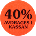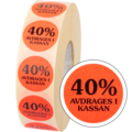 Rund etikett med text ''40% avdrages i kassan'' är etiketten för dig som vill rea ut eller sänka priset på produkter i din butik. Den röda färgen får kunderna att lägga märke till priset och produkten.