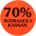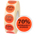 Rund etikett med text ''70% avdrages i kassan'' är etiketten för dig som vill rea ut eller sänka priset på produkter i din butik. Den röda färgen får kunderna att lägga märke till priset och produkten.