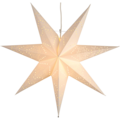 Vacker julstjärna i vit mönstrat papper. Stjärnan hängs i ett fönster där den sprider en härlig julstämning.