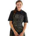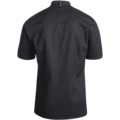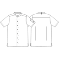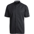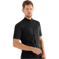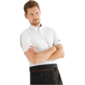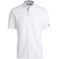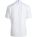 Modern passform. Kina krage. Kontrasterande inre krage. Sydda knappar med kontrasterande tråd. Kort ärm. Halsrem för bröstlappsförkläde. Två pennfickor på vänster ärm. Sprund i sidorna.